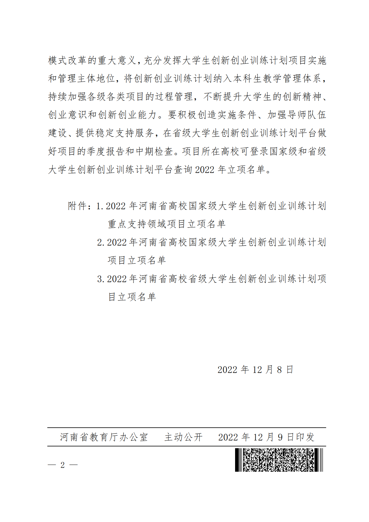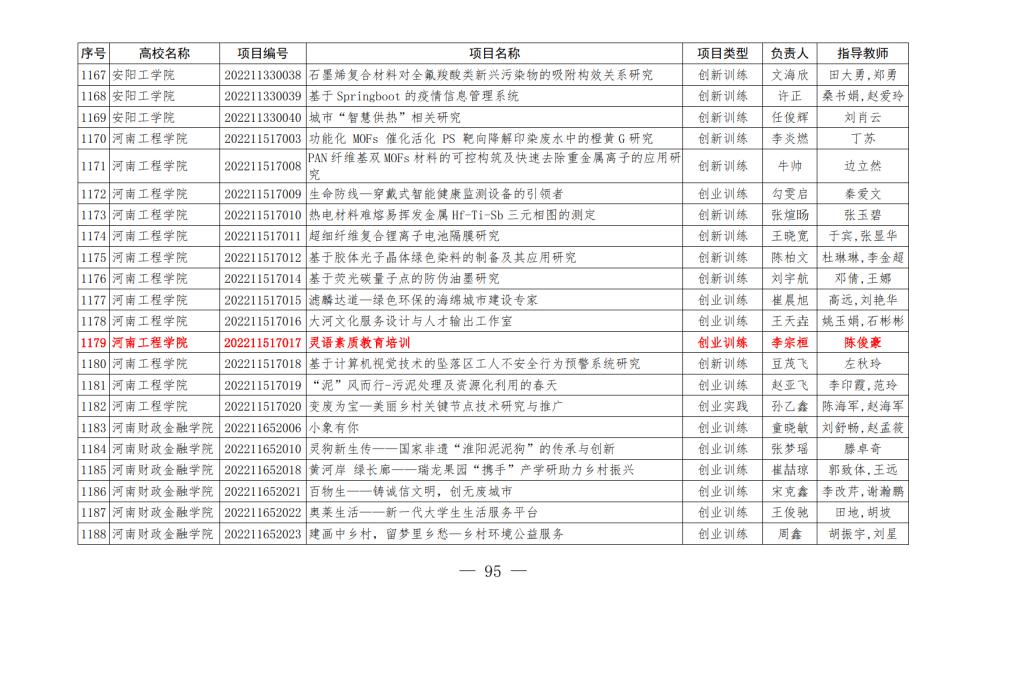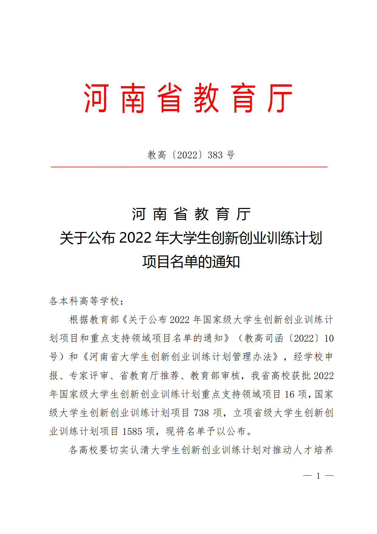 近日,省教育厅发布了2022年大学生创新创业训练计划项目名单,经学校申报、专家评审、省教育厅推荐、教育部审核,我省高校获批2022年国家级大学生创新创业训练计划重点支持领域项目16项,国家级大学生创新创业训练计划项目738项,立项省级大学生创新创业训练计划项目1585项。