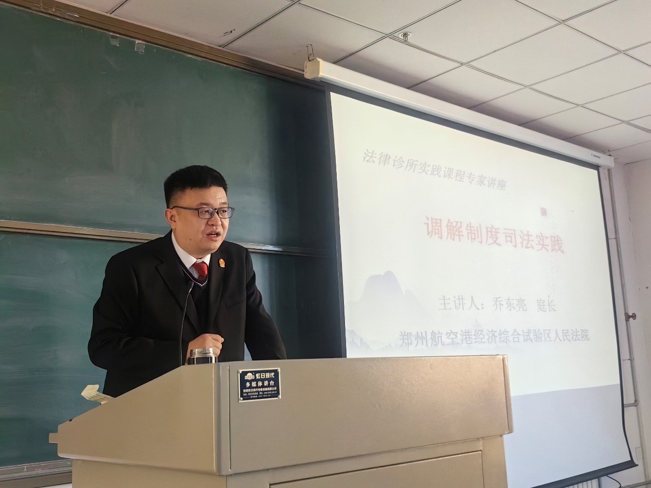 2025年12月3日下午,郑州航空港综合实验区人民法院乔东亮庭长、王思琦法官应邀来我院给知识产权专业学生上实践教学课。