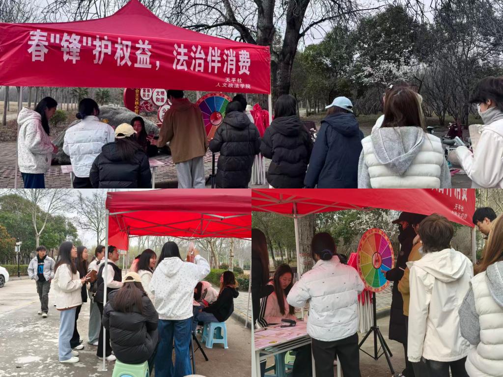 3月15日,人文政法学院天平社在南校区“三棵树”举办法治宣传与消费者权益保护现场活动。本次活动旨在通过生动的普法宣传与互动体验,增强在校大学生的法律意识与自我保护能力。