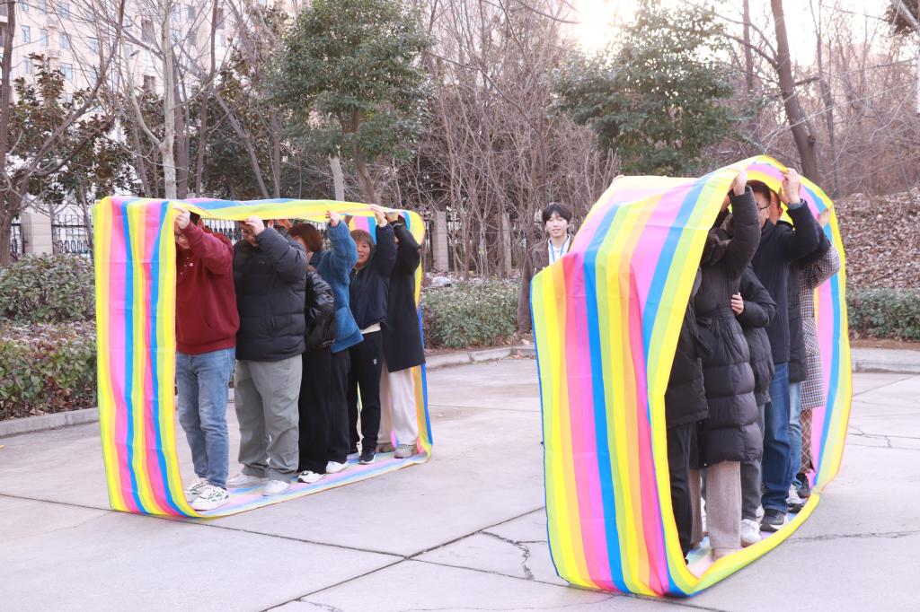 团队协作展风采,默契配合燃激情。珠行万里赛道上,队员们手握U型槽紧密衔接,目光紧盯跳跃的乒乓球,当乒乓球精准落入终点桶时,全场欢呼雷动;风火轮滚滚项目中,五颜六色的环形履带如游龙前行,队员们高喊“左、右、左!”统一步伐,布带内同步挪动的身影成为冬日暖阳下最动人的风景。个人挑战添趣味,传统文化显特色。投壶区古韵盎然,箭矢划出优雅弧线;套圈摊位前排起长龙,老师们各显身手,每当套中奖品,围观人群便爆发出热烈掌声。